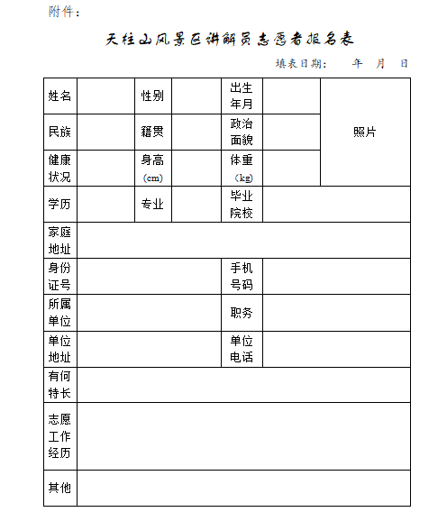 ? ? ? ? 1.《天柱山風(fēng)景區(qū)講解員志愿者報名表》(見附件);