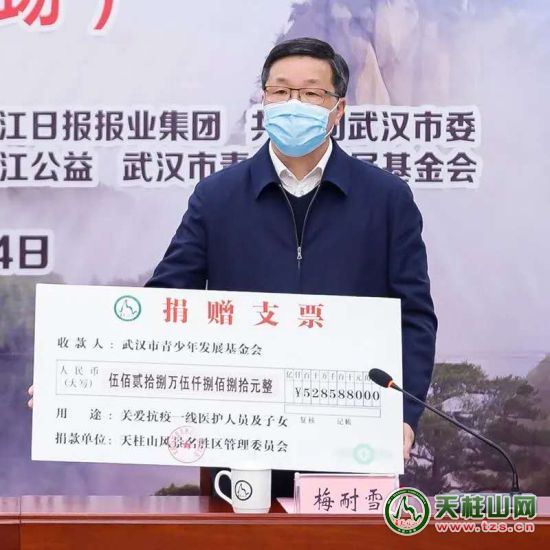 中共潛山市委書記張勁松出席捐贈儀式并致辭,市委副書記、市人民政府市長、天柱山管委會主任梅耐雪代表天柱山管委會向長江日報長江公益、武漢市青少年發(fā)展基金會捐贈資金5285880元,市委常委、天柱山管委會副主任涂高生,市人民政府副市長蔡婷婷出席儀式。長江日報報業(yè)集團負責人出席儀式并講話,共青團武漢市委負責人向天柱山管委會頒發(fā)榮譽證書,天柱山風景區(qū)、長江日報長江公益、武漢市青少年發(fā)展基金會三方代表簽訂《天使的孩子—關愛武漢抗疫醫(yī)護人員及子女·天柱山基金》協(xié)議書。