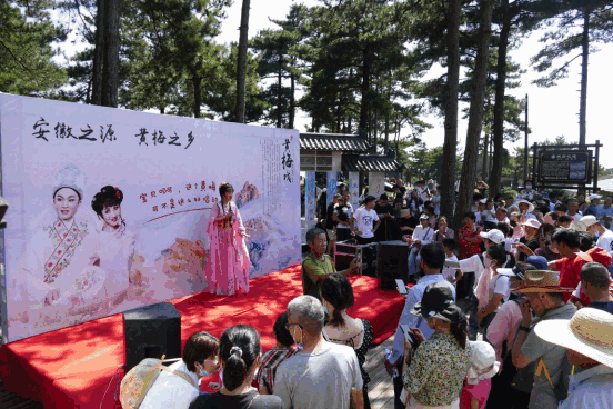 在游客服務(wù)中心及大龍窩索道上站廣場(chǎng),多場(chǎng)黃梅戲連臺(tái)演出,臺(tái)上演員與臺(tái)下游客頻繁互動(dòng),婉轉(zhuǎn)悠揚(yáng)的黃梅鄉(xiāng)音在山谷間蕩漾,廣大游客沉醉其中,真切感受到了“樹(shù)上的鳥(niǎo)兒成雙對(duì),綠水青山帶笑顏”的意韻。