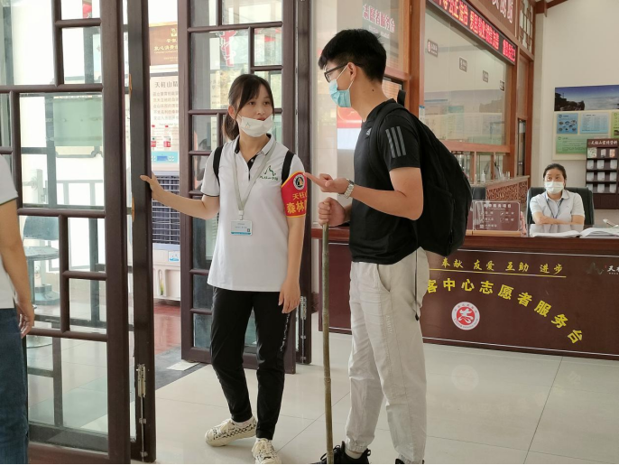 秋日明媚,天空湛藍,天柱山景區(qū)彩旗飄飄,游客絡繹不絕,歡聲笑語中更顯節(jié)日濃厚的喜慶氛圍?!白鹁吹挠慰?#xff0c;請佩戴好口罩,保持一米間距”“請到這邊來掃安康碼”身穿紅馬甲,頭戴小紅帽的天柱山旅游志愿者的語音在游客中心廣場上此起彼伏。