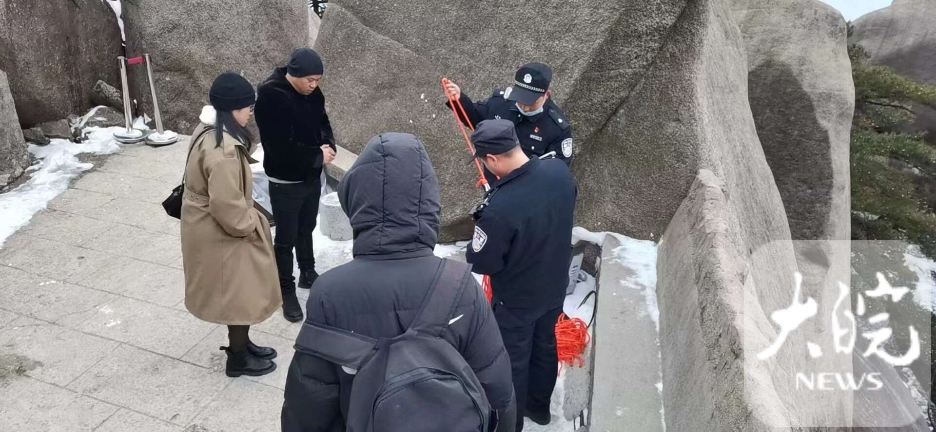 天柱山景區(qū)執(zhí)法大隊(duì)主峰景區(qū)中隊(duì)隊(duì)員葛臣第一時(shí)間趕往現(xiàn)場(chǎng)。經(jīng)查看,發(fā)現(xiàn)懸崖陡峭,高達(dá)10米,加上那段時(shí)間正值大雪天氣,懸崖結(jié)冰打滑,無(wú)法施救。吳女士又撥打110尋求幫助。接報(bào)后,茶莊派出所兩名輔警到達(dá)現(xiàn)場(chǎng),仍無(wú)法施救。經(jīng)商議,吳英同意放棄施救,下山回到嘉興。