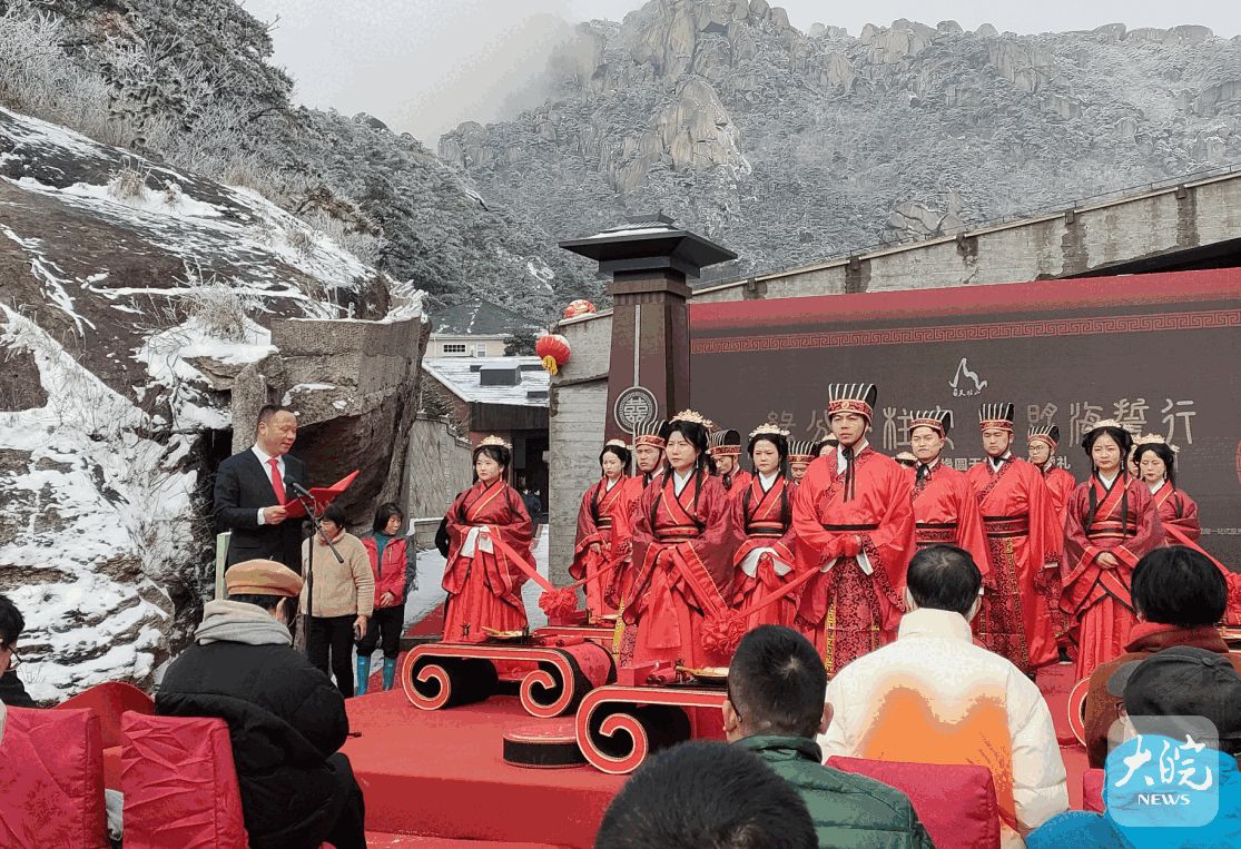 大皖新聞訊 ?緣分天柱定,山盟海誓行。2月14日上午,在群峰環(huán)繞間,婉若“綠寶石”的天柱山煉丹湖畔,一場穿超千年的“執(zhí)子之手 緣圓天柱”集體婚禮甜蜜舉行。